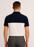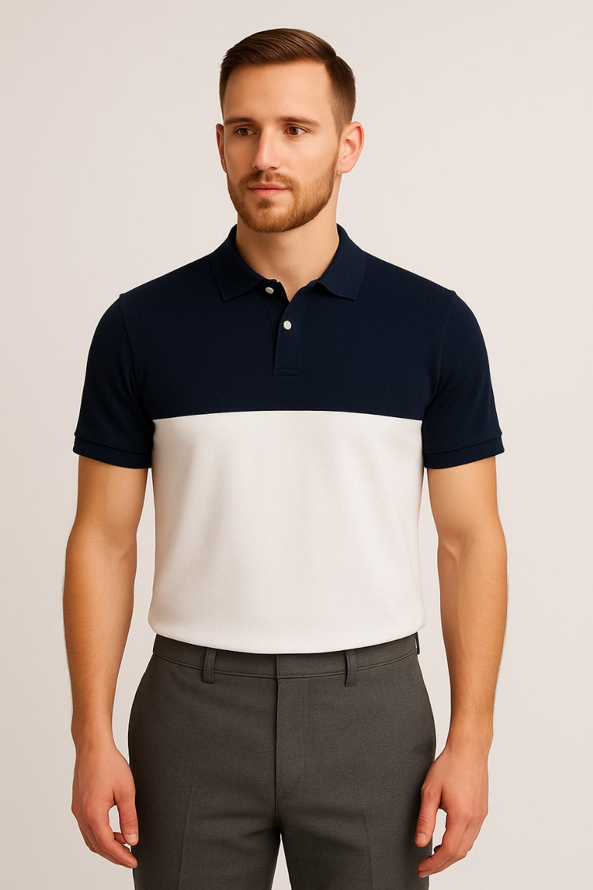 This premium contrast polo shirt blends timeless style with modern sophistication. Designed with a sharp navy blue upper panel and a clean white lower section, it delivers a striking color-block effect that stands out.